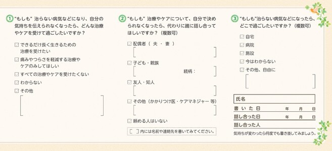「もしも手帳」には、「もしも治らない病気等になったら」「もしも自分の気持ちを伝えられなくなったら」というときを想定して、3つの質問が載っています。
