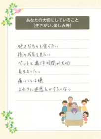 ★思ったより簡単で、さらっと書けました。一人で考えたときはあまり深く考えなかったですが、夫に話すことで、なぜその選択肢を選んだのか、理由を自分でも整理しながら相手に伝えることができました。これまでこのような話はしたことがありませんでしたが、「『もしも手帳』っていうのをもらったんだけど」と話を切り出しやすかったです。