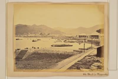 ウィードは横浜だけではなく、長崎の風景も撮影しています。長崎にも横浜と同様「外国人居留地」がつくられました。右手の洋館が建ち並ぶあたりが大浦居留地。奥の中央から左に見えるのが、江戸時代オランダ人が住んでいた「出島」です。
