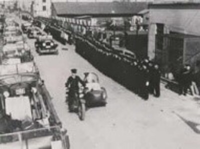 横浜消防の昔と今を、出初式という面から見てみましょう。次の画像は、1949(昭和24)年1月に実施された、自治体消防としての第1回目の出初式の写真です。中区の住吉町で挙行されました。