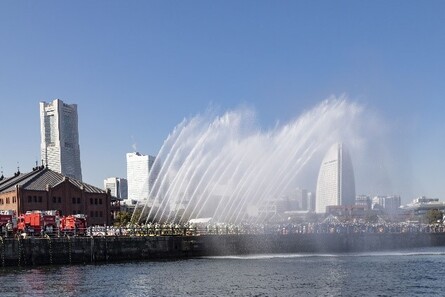 そして、その次の画像は、2023(令和5)年1月に実施した「横浜消防出初式2023」での一斉放水の模様です。現在の横浜消防出初式は、約7万5000人の方が訪れる大規模なイベントとなっています。「横浜消防出初式2024」は、2024(令和6)年1月7日(日曜日)の開催となります。今まで以上に皆様に楽しんで、そして満足していただけるようなイベントを企画しています。ぜひ、会場の横浜赤レンガ倉庫にお越しください。SNSのX(旧Twitter)の横浜消防出初式2024公式アカウント(外部サイト)からも情報を発信しています。