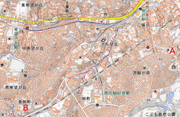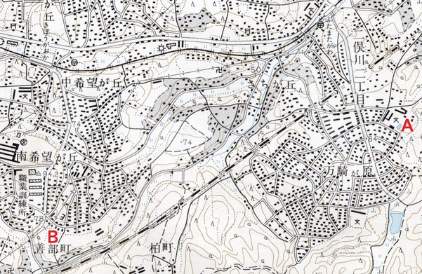 図1の南西端に見える善部町の方(図中B)から浅い谷をたどる小川は田んぼに並行していて、森に面した南側の流れは水がきれいだった。子供の頃はこのあたりでカエルを捕って遊び、たまにサワガニを見かけたものである。あぜ道を歩いているとアオダイショウに遭遇して驚いたことも。その田んぼも現在の図2では跡形もなく消え、戸建ての住宅やマンションに姿を変えている。旭高校の2年生だった1976(昭和51)年には相模鉄道いずみ野線も開通、雑木林はたちまち現在のような住宅地に変貌した。