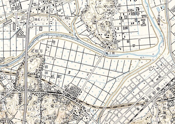 図3 空き地の目立つ新横浜駅とその周辺。鶴見川と鳥山川の合流するあたりには水田が広がっていた。1:25,000地形図「荏田」昭和47年(1972)修正