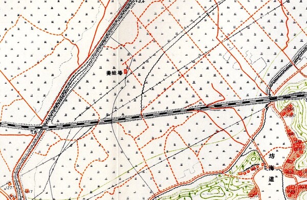 図5 戦争が終わってまだ間もない頃。見渡す限りの田んぼの中に「養蛙場」が目立つ。食糧難のこの時代、ここで食用ガエルを養殖していた。1:10,000地形図「菊名」昭和23年(1948)修正