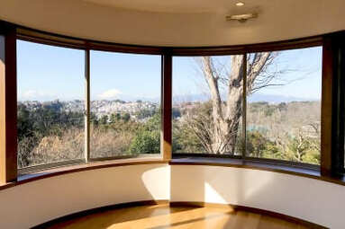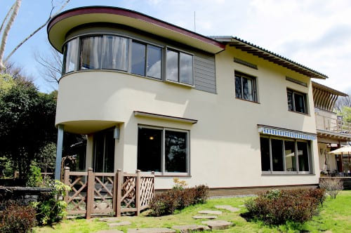 外観でひときわ目立つのは、2階にある半円形の展望室です。晴れた日には、遠く富士山や丹沢山系を望むことができます。外観や眺望に加え、壁や床材、扉や灯具など、内装にもさまざまな意匠が施され、随所に見どころがありますのでご注目ください。特に、象嵌模様が美しい玄関ホールの引き戸や、秀逸なデザインが目を引く居間のランプシェードは必見です。