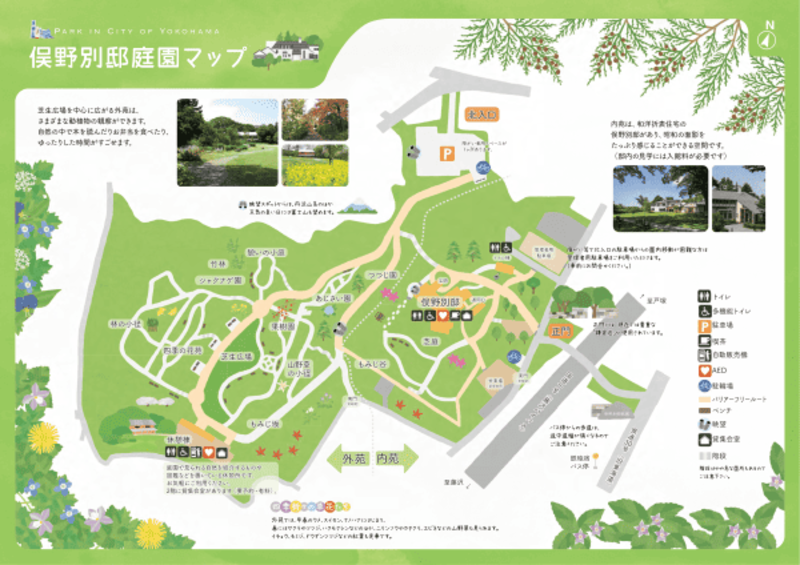 園内は、横浜市認定歴史的建造物に指定されている俣野別邸を中心とした内苑区と、開放的な芝生広場や四季折々の花が楽しめる外苑区で構成されています。