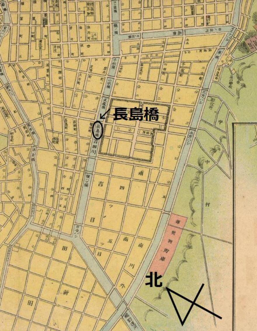 【画像2】「改正横浜市全図」より長島橋付近 鈴木陌三郎編 1898(明治31)年 横浜開港資料館蔵