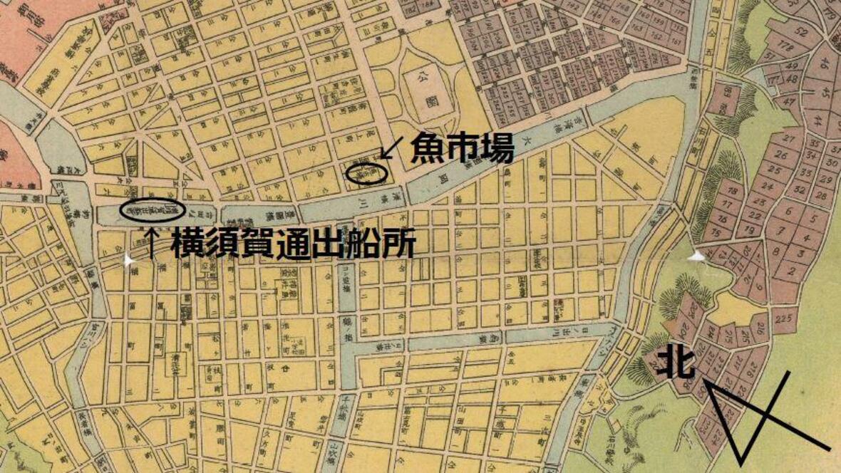 画像1の写真は新吉田川の長島橋付近(現在の伊勢佐木長者町駅と阪東橋駅の中間付近)を撮影したものです。新吉田川は1896(明治29)年に開削されました。明治時代、吉田新田側の市街地化が進んだ横浜では、河川の整備・開削も行われ、自然河川の大岡川とともに河川運河網を形成しました。画像2は、1898(明治31)年に発行された「改正横浜市全図」という地図から長島橋付近を抜き出したものです。地図には、新吉田川のほか、新吉田川と大岡川を結ぶ新富士見川、吉田川と中村川を結ぶ日ノ出川も確認できます。また、「改正横浜市全図」からは、整備された河川運河が水運網として機能していたことを読み取ることができます。画像3は「改正横浜市全図」から派大岡川の周辺を抜き出したものです。横浜公園のあたりには、生鮮食品を取り扱う食品市場が設けられ、川沿いには市場向けの商品を取り扱う問屋や卸屋も見られました。横須賀や東京行きの汽船航路も置かれ、港町には横須賀行きの定期航路・貞喜丸汽船会社の発着場がありました。