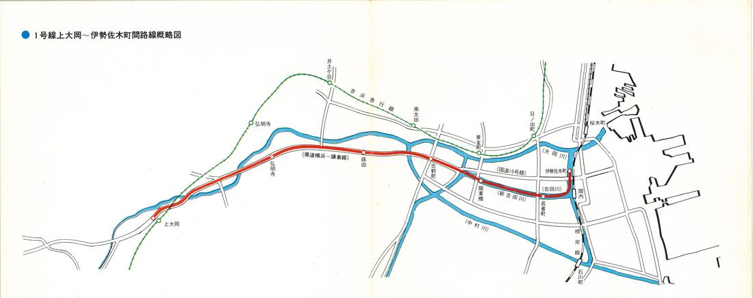 【画像8】「1号線上大岡~伊勢佐木町間路線概略図」(『新しい市民の足 地下鉄』) 横浜市交通局高速鉄道建設部 1967(昭和42)年 横浜都市発展記念館蔵