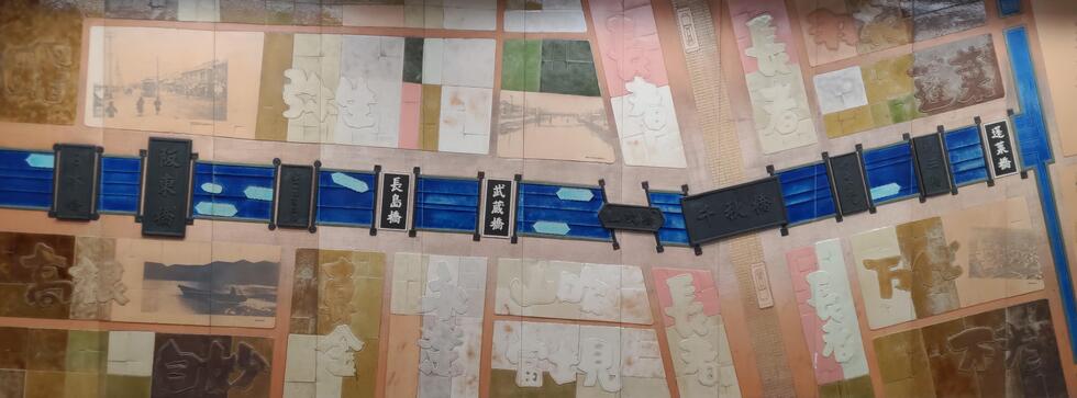 1960年代以降、横浜市では大規模都市計画(「六大事業」)が構想されます。構想のなかで、河川運河は高速鉄道計画(横浜市営地下鉄)と高速道路網計画(首都高速道路)による開発の対象となっていきます。画像8は横浜市営地下鉄の路線の計画図です。青色の線は川、赤線は地下鉄の計画線を示しています。地下鉄は派大岡川の一部と吉田川・新吉田川を埋め立てるかたちで建設され、地上部には大通り公園が整備されました。この工事で、長島橋を含む吉田川・新吉田川上の橋梁は姿を消しましたが、橋梁の痕跡は、伊勢佐木長者町駅に設置されたレリーフに見ることができます【画像9】。1981(昭和56)年に設けられたレリーフには、吉田川・新吉田川に架かっていた10橋の橋名板が埋め込まれており、現在も市民の憩いの場となっている大通り公園が、かつて市民に親しまれた運河だったことを伝えています。