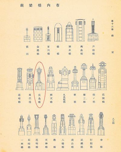 【画像7】『横浜復興誌』第二編より、復興で設けられた長島橋の親柱(赤丸は筆者加工) 横浜市役所編 1932(昭和7)年 横浜開港資料館蔵