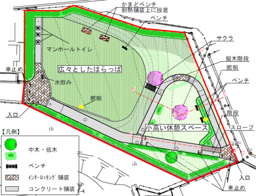 ④主な施設 はらっぱ、マンホールトイレ(地下下水管のみ、浄水タンクなし)