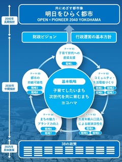 2040年頃の横浜のありたい姿「共にめざす都市像」の実現に向け、全ての政策分野の基軸に据える上位指針としての基本戦略「子育てしたいまち 次世代を共に育むまち ヨコハマ」に加え、9つの戦略と38の政策等を取りまとめました。