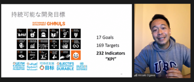講演では、小川様から、国際連合事務局(経済分野)における組織・業務の概要、現在に至るご自身の仕事内容、持続可能な開発目標(Sustainable Development Goals;SDGs)に係る指標の整備と進捗状況についてお話しいただきました。