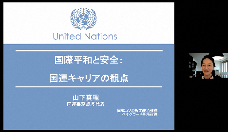 講演会では、山下様から「国際平和と安全:国際キャリアの観点」をテーマに、①専門分野編(「国際平和と安全」)として、国連の魅力、国際平和に係る国連の信念と国連憲章、国際平和と安全の動向、紛争予防、平和と安全のための国連アクター、国連予防外交の具体例や現在所属されている国連コソボ暫定統治機構(UNMIK)などについて、②キャリア編(「国際キャリアの観点」)として、ご自身のキャリアと国連における勤務環境などについてお話しいただきました。