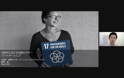 第四回第一部 国連開発計画(UNDP)対外関係・アドボカシー局(BERA), 政策・プログラム支援局 (BPPS), 金融セクターハブ (FSH)民間セクターパートナーシップアドバイザー 野田眞様 講演(令和3年5月15日(日本時間)