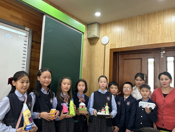 ウランバートル第23学校からは5年生が廃材を使った作品を紹介しました。レジ袋とチョコレートの箱で作ったパラシュートや、ペットボトルを活用した作品には浄水器やクリスマスツリー、モンゴル遊牧民の伝統家屋ゲル、ペン立てなどがありました。ティーパックの箱を自分のアクセサリーボックスに変身させた生徒もいました。