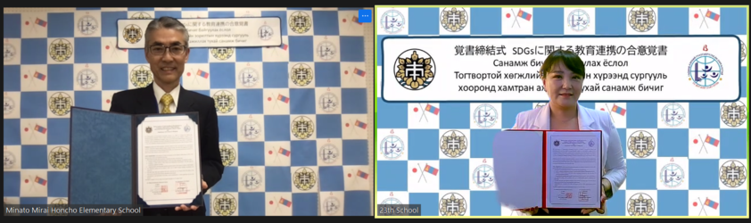 これまでの交流事業の成果をふまえ、みなとみらい本町小学校及びウランバートル第23学校は、SDGsに関連した教育活動の連携を更に発展させることを目的として、SDGsに関する教育連携の合意覚書(Memorandum of Understanding、MOU)を締結しました。