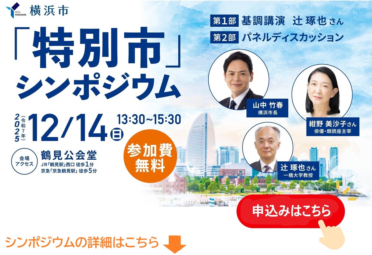 令和6年11月23日 (土曜日) | 横浜の未来を用意する 特別市の法制化へ~「特別市」シンポジウム~ | 港南区民文化センターひまわりの郷 (港南区上大岡西1-6-1) | <基調講演> 「特別市の法制化の実現に向けて」 ・辻󠄀 琢也 さん(一橋大学教授) <座談会> ・原 日出子 さん(俳優) ・辻󠄀 琢也 さん(一橋大学教授) ・横浜市長 |