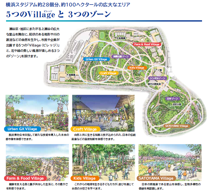 GREEN×EXPO 2027では、上瀬谷の広大な里山を舞台に、起伏のある地形や川の源流などの自然を生かし、市民や企業が出展する5つの「Village(ビレッジ)」と、花や緑の美しい風景が楽しめる3つの「ゾーン」を設けます。