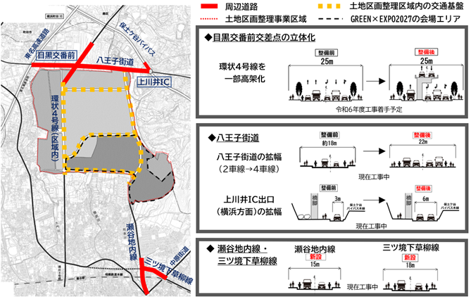 上瀬谷周辺では、八王子街道と環状4号線が交差する目黒交番前交差点などで、慢性的な交通渋滞が発生しています。渋滞の解消や、会場への円滑なアクセスルートの確保を図るため、GREEN×EXPO 2027の開催までに、目黒交番前交差点の環状4号線立体化、八王子街道を2車線から4車線に拡幅するなど、多くの来場者を快適にお迎えできるよう環境を整えていきます。