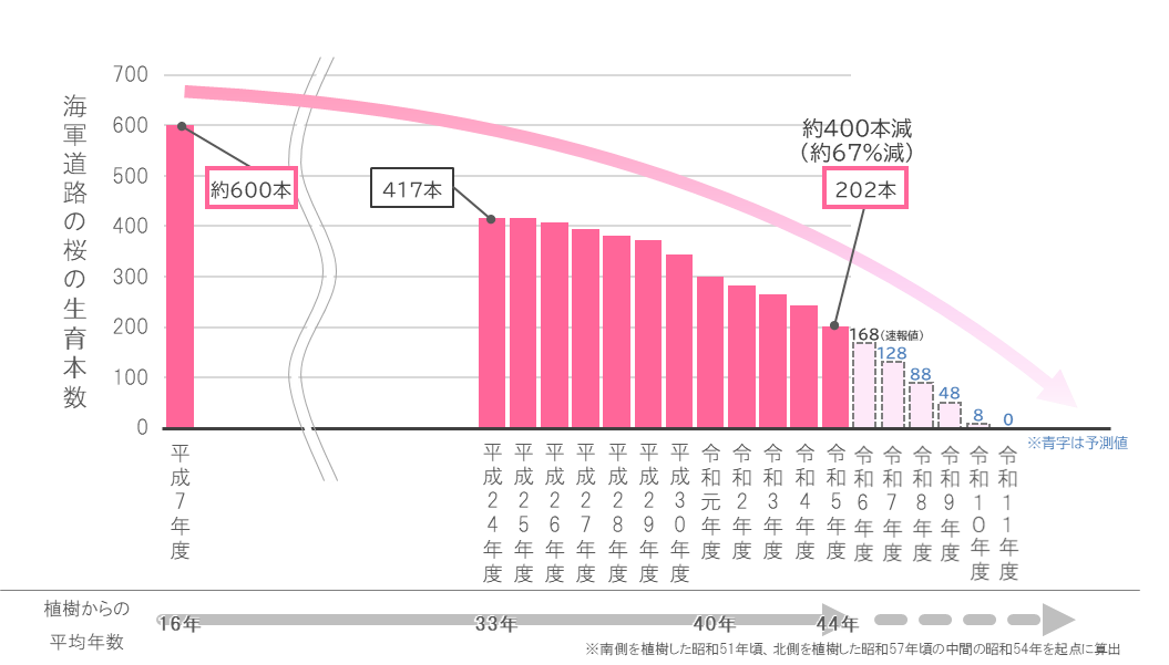 海軍道路の桜並木は、植樹から40年以上が経過しており、健全な桜が急速に減少し、台風等で落ち枝や倒木が発生するなど、不健全な状態が見受けられます。