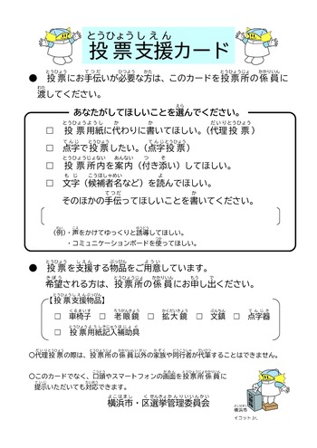 このカードに記入して、投票所の係員に提示していただくと、投票所で説明することなく、代理投票や点字投票など、必要な支援をスムーズに受けることができます。