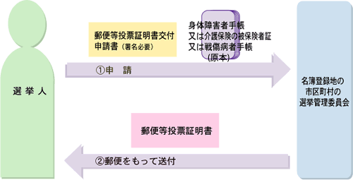 1)選挙人は、お住まいの区の選挙管理委員会に対し、選挙人が署名した「郵便等投票証明書交付申請書」に、身体障害者手帳、戦傷病者手帳または介護保険の被保険者証のいずれかを添えて、申請します。