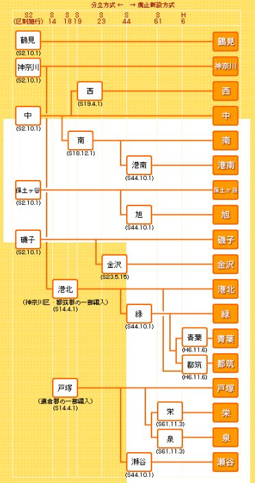 昭和44(1969)年10月1日 | 南区、保土ケ谷区、港北区、戸塚区が再編成され、それぞれ港南区、旭区、緑区、瀬谷区が新設される。 | 14区 |