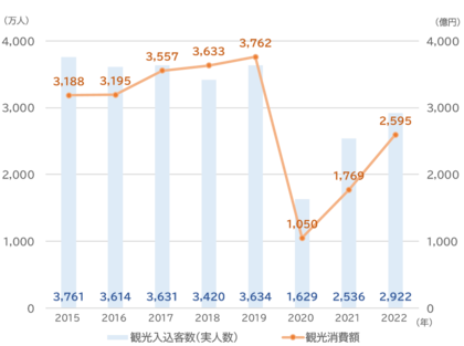 横浜市の2015~2019年(5か年)の観光入込客数の平均は3,612万人であり、観光消費額の平均は3,467億円でした。