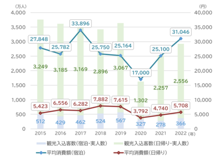 ・日帰り客の平均観光入込客数は3,113万人であり、平均消費額は6,752円となっています。
