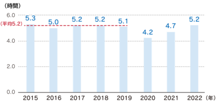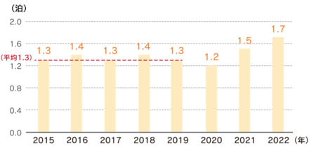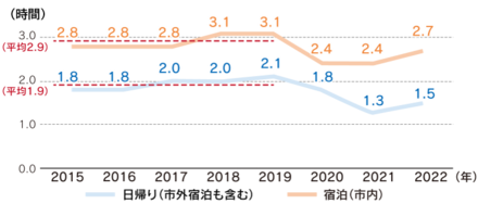 2015~2019年(5か年)の宿泊客の平均宿泊数は約1.3泊、日帰り客の平均滞在時間は約5.2時間となっています。