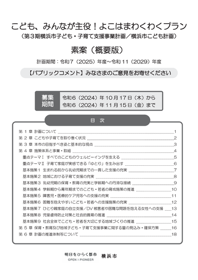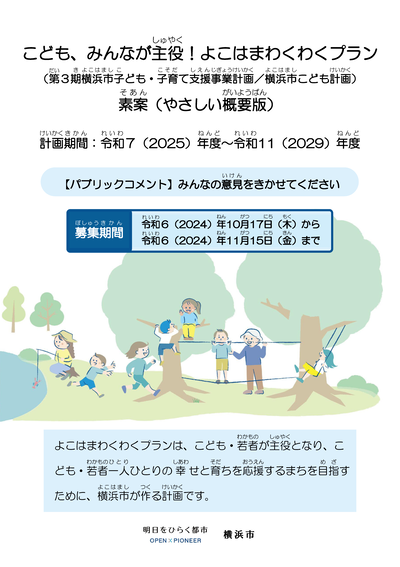 横浜市では、「こども、みんなが主役!よこはまわくわくプラン」(第3期横浜市子ども・子育て支援事業計画/横浜市こども計画)(以下、「計画」という。)の策定に向けて、令和6年10月に計画素案を公表し、パブリックコメントを実施しました。
