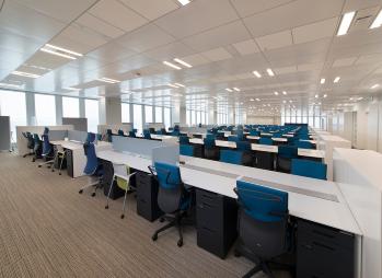 デスク等の什器の規格・デザインを共有化し規則的に配置することで、スペースを有効活用しています。人員の増減にも柔軟な運用が可能となっています。