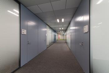 すべてのエレベーターが停止する18階を共用会議室フロアとし、約50室の大小会議室を集約して配置しています。プロジェクタや無線LANを常設し、庁内ネットワークに接続することでペーパーレスを促進します。