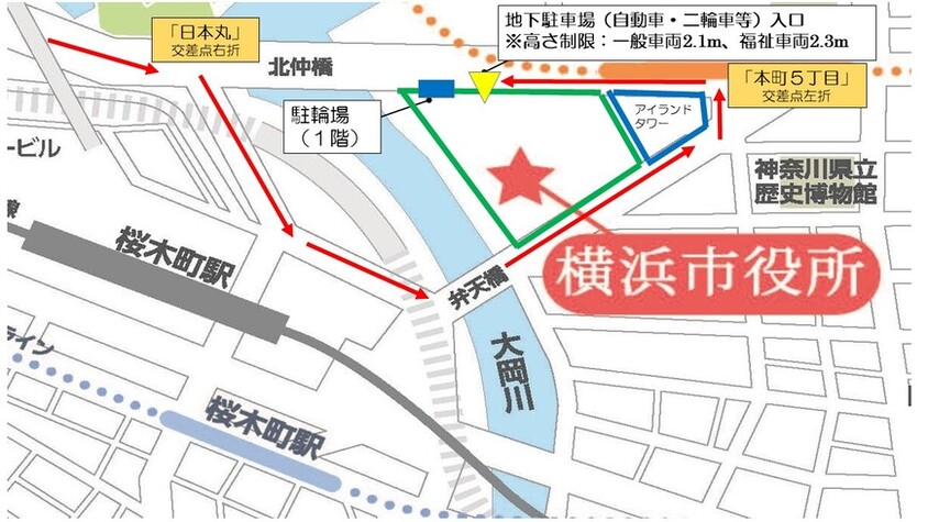 1 みなとみらい方面からの車両は、「市役所」交差点でUターンして駐車場へ進入することはできません。