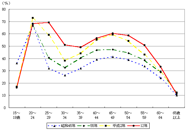 女性の場合、年齢階級別にグラフを描くとM字型となり、これは結婚・出産などで仕事をやめ、子育てが一段落してから再び働く就業パターンを示します。