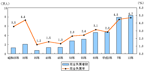 戦後における完全失業率の推移をみると、高度経済成長により昭和30年の4.4%から35年の1.2%へと大幅に低下した後、45年までは1%台で推移し、ほぼ完全雇用の時代が続きました。その後、石油危機、円高、バブル崩壊等による不況の影響により上昇し、平成7年には戦後最も高い4.5%となりました。さらに、金融不安や消費低迷、海外への生産拠点の移転など産業の空洞化に伴う雇用情勢の悪化で、12年は4.7%と依然高い水準が続いています。