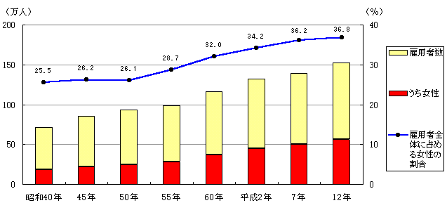 これを男女別にみると、昭和45年までは男女とも20%を超える増加率を示していました。しかし、男性は55年には石油危機後の厳しい雇用環境下でわずか3.3%の増加にとどまりました。その後は10%台の増加で推移していましたが、高齢化の進展などにより平成7年は4.8%に低下し、12年はマイナス2.1%と戦後初めて減少に転じています。一方、女性は昭和55年以降、就業意識が高まり、男性を大きく上回る伸びが続いていますが、平成7年は11.0%、12年は4.4%と近年増加率は低下しています。