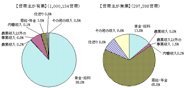 家計の収入の種類 世帯を、世帯の生計を維持するための世帯全体の収入の種類により、次のとおり区分している。 賃金・給料が主な世帯----主な収入が、会社・団体・官公庁・個人商店などに雇われている人の勤め先から得ている賃金・給料・賞与・役員手当などである世帯 農業収入が主な世帯-----主な収入が、個人経営の農業(農作物の栽培、家畜の飼育、耕作請負など)から得られる収入である世帯 農業収入以外の事業収入が主な世帯-----主な収入が、個人商店などのように農業以外の個人経営の事業から得られる収入や、自営の医師、弁護士、文筆家などの収入である世帯 内職収入が主な世帯-----主な収入が、内職(家庭内で行う賃仕事)から得ている収入である世帯 恩給・年金が主な世帯----主な収入が、恩給・退職年金・老齢年金・障害年金・遺族年金などの収入である世帯 仕送りが主な世帯------主な収入が、別に住んでいる親族や知人からほぼ定期的に送られてくる生計費である世帯 その他の収入が主な世帯---主な収入が、上記以外で、例えば、家賃・地代、利子・配当、雇用保険、生活保護、土地売却代金、退職金などの収入や、預貯金の引出しなどである世帯 |