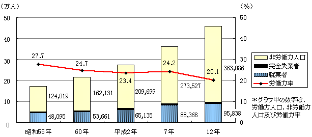 平成12年の15歳以上人口(2,940,204人)の労働力状態をみると、労働力人口(就業者及び完全失業者)は1,783,068人で、平成7年に比べ3,001人(0.2%)増加しています。また、労働力率(15歳以上人口に占める労働力人口の割合)は60.6%で、平成7年を2.7ポイント下回り、昭和55年以来20年ぶりの低下となっています。