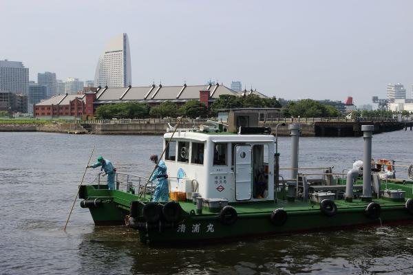 業務委託先の一般社団法人横浜清港会の協力を得て、清掃船に乗り、海上清掃作業に密着。