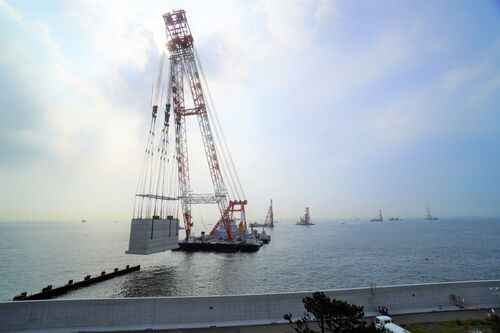 この護岸は、本体となるコンクリートの箱、いわゆるケーソンの壁面に、波を穏やかにするスリットを設け、上部は日が差し込む構造とし、中には自然石を敷いて、海藻や海生生物が生息する自然の岩礁を、深さを変えて再現します。これにより、海藻類が繁茂し、稚魚の成育や産卵の場としていきます。