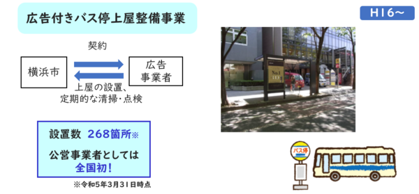 この手法は、本市交通局にとってバス停上屋の設置、維持管理にかかる費用の抑制だけではなく、バス待ち環境整備の向上を目的として、平成16年から民間活力を導入している事業です。
