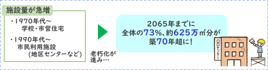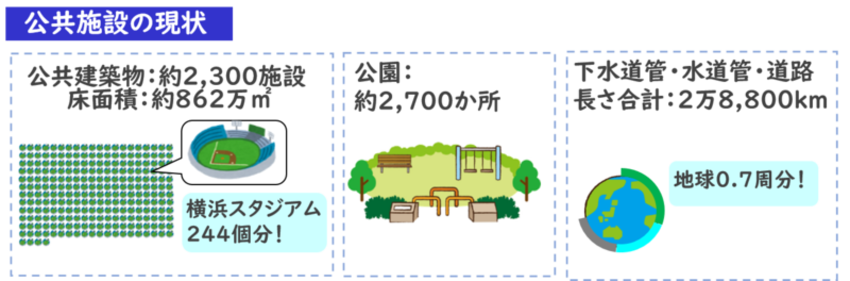 本市公共施設の保全更新の方向性を定める「横浜市公共施設等総合管理計画」を策定するとともに、主要施設ごとに適正化に向けた計画を策定するなど、公共施設の適正化を推進