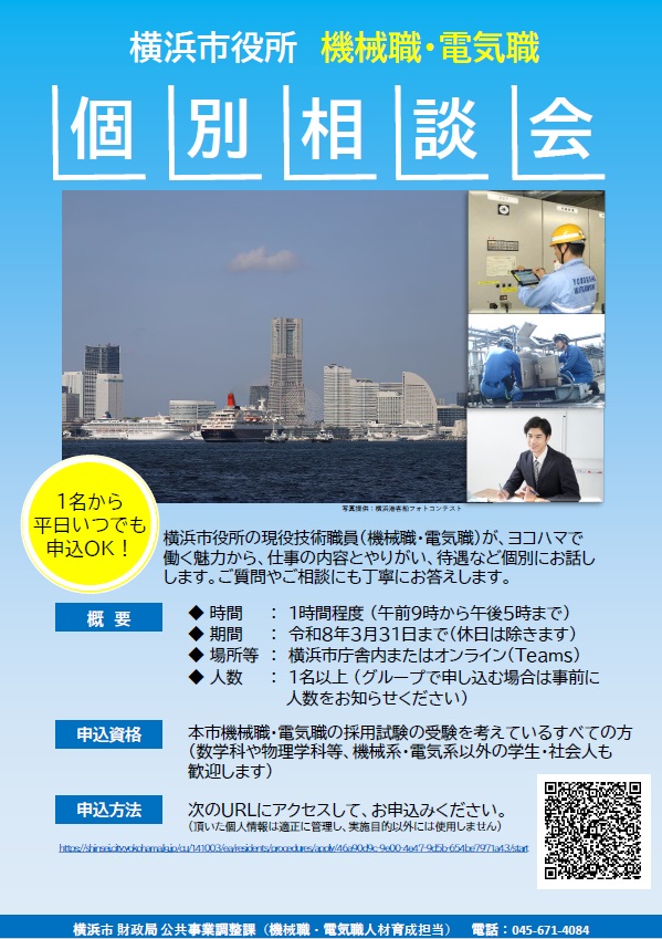 | 概要 | 横浜市職員採用試験の試験区分「機械」または「電気」で受験することを考えている方が参加できる個別相談会です。