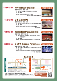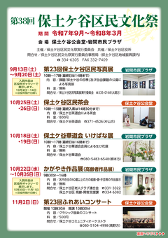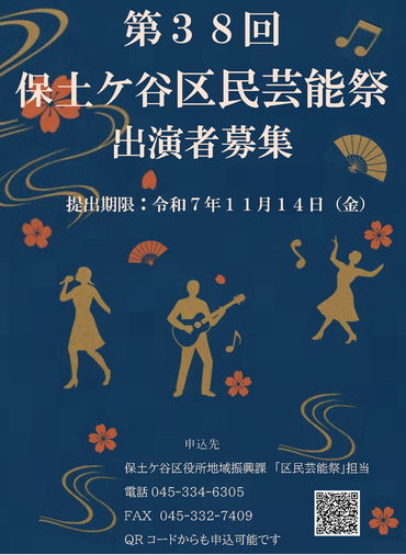| 第38回保土ケ谷区民芸能祭 | 終了しました。 | 令和8年1月18日(日曜日) | 保土ケ谷区内サークル・個人による舞踊、唄、ダンス、楽器演奏等 | 保土ケ谷公会堂 | 区民文化祭実行委員会事務局 |