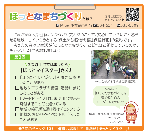 保土ケ谷区では、様々な人や団体が、つながり支えあうことで、安心していきいきと暮らせる地域にしていこうとする「保土ケ谷ほっとなまちづくり(地域福祉保健計画)」を策定しています。