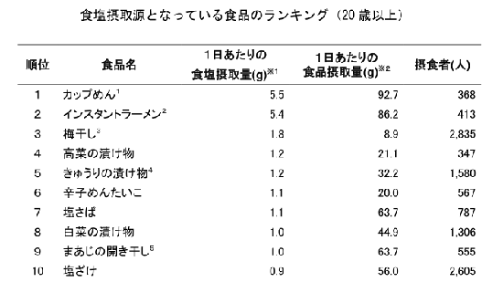 上位には、カップ麺等のインスタント食品や漬物や塩蔵品が多く占めています。食塩摂取量が多いこれらの食品を食べるときは、1回当たりの量や食べる頻度に気をつけましょう。また、漬物にしょうゆをつけて食べるとさらに塩分摂取量が上がるので、調味料の使用は控えましょう。