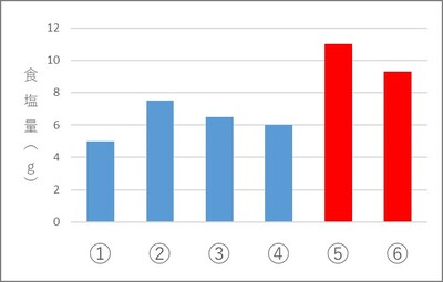 グラフの青色(①~④)はそれぞれのガイドライン等における目標値で、赤色(⑤~⑥)は日本人が摂取している塩分量です。 すべての目標量より日本人の摂取量が上回っていることがわかります。